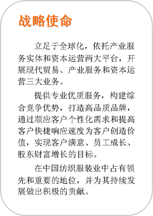 產(chǎn)業(yè)服務(wù)業(yè)是紡織工貿(mào)集團(tuán)在未來五年中加速發(fā)展的戰(zhàn)略業(yè)務(wù),該板塊主要是圍繞著集團(tuán)紡織服裝這一主業(yè),通過整合集團(tuán)資源,提升資源使用效率,獲取產(chǎn)業(yè)鏈競爭優(yōu)勢,重點打造廣州T.I.T國際紡織城。