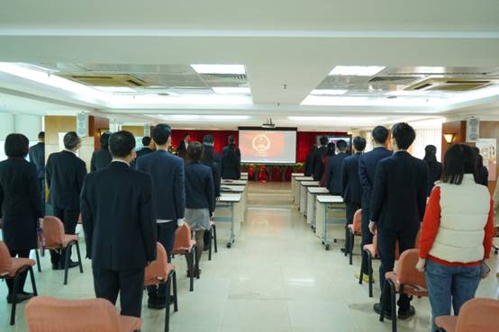 公司升國旗儀式現(xiàn)場,全體參會員工起立奏唱國歌