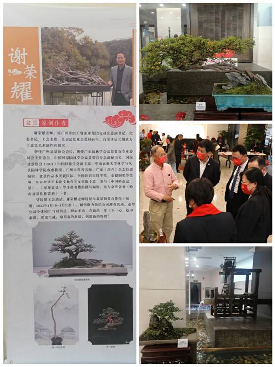 盆景是以植物和山石為基本材料在盆內(nèi)表現(xiàn)自然景觀的藝術(shù)品。為激勵(lì)廣大員工“穩(wěn)中求進(jìn)”穩(wěn)健邁步“十四五”,原廣州紡織工貿(mào)企業(yè)集團(tuán)公司黨委副書(shū)記、紀(jì)委書(shū)記、工會(huì)主席謝榮耀老師(現(xiàn)任廣東園林學(xué)會(huì)盆景賞石專業(yè)委員會(huì)主任委員)受邀公益展示了原創(chuàng)的《不忘初心》、《根深基穩(wěn)一往無(wú)前》、“咬定青山”等10個(gè)盆景靈石佳作,一枝一葉,一盆一景,妙趣橫生,寓意深刻,勵(lì)志鼓舞,吸引廣大員工駐足鑒賞。