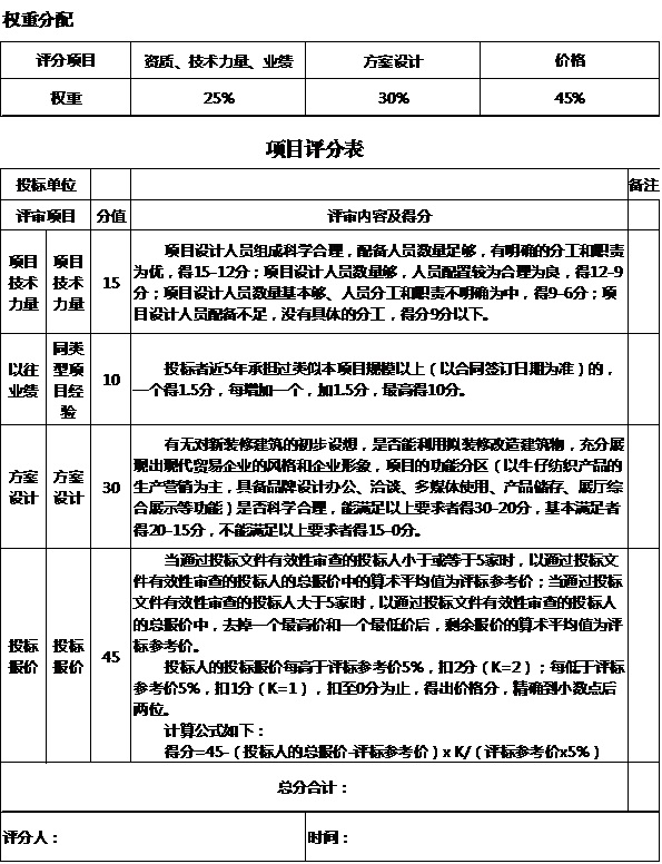 十三、本招標(biāo)項(xiàng)目以評分權(quán)重分配原則進(jìn)行評標(biāo),評分項(xiàng)目含有資質(zhì)、技術(shù)力量、業(yè)績,占比25%;方案設(shè)計(jì),占比30%;投標(biāo)價(jià)格,占比45%。以綜合得分高者中標(biāo)。項(xiàng)目評分表詳見附件。