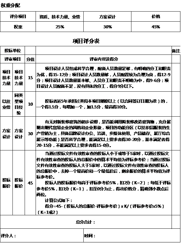 十三、本招標(biāo)項(xiàng)目以評(píng)分權(quán)重分配原則進(jìn)行評(píng)標(biāo),評(píng)分項(xiàng)目含有資質(zhì)、技術(shù)力量、業(yè)績,占比25%;方案設(shè)計(jì),占比30%;投標(biāo)價(jià)格,占比45%。以綜合得分高者中標(biāo)。項(xiàng)目評(píng)分表詳見附件。