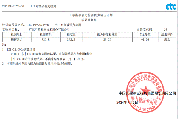 近日,廣東廣紡檢測技術(shù)股份有限公司收到中國國檢測試控股集團(tuán)股份有限公司組織的CTC-PT-2024--36土工布撕破強(qiáng)力檢測能力驗(yàn)證計劃滿意結(jié)果通知單。