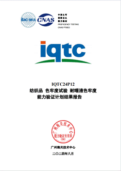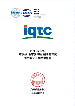近日,廣紡檢測收到廣州海關技術中心組織的IQTC24P12紡織品耐唾液色牢度和IQTC24P07紡織品耐水色牢度能力驗證計劃結果報告,結果均為滿意!