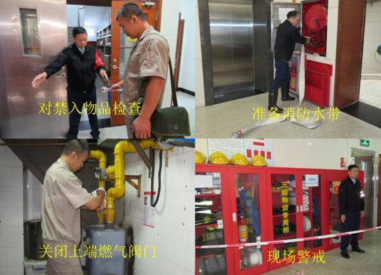 演練模擬飯?zhí)霉ぷ魅藛T在做飯過程聞到燃氣異味,燃氣自動關閉裝置暫未有動作,于是立即出來報告,并順路關閉手動燃氣閥門。其他飯?zhí)霉ぷ魅藛T也隨即關閉燃氣爐具,相互提醒嚴禁觸摸電器開關,打開爐具專用水閥放水降溫,在撤退過程準備好滅火器,打開窗戶透氣?,F(xiàn)場控制組在接到應急指揮中心的命令后,對飯?zhí)贸鋈肟诶鹁渚€,接上消防水帶模擬對現(xiàn)場降溫,對需要進入泄漏區(qū)關閉上端燃氣閥門的排險人員,確認沒有穿帶釘鞋和化纖衣服,沒有攜帶使用金屬工具。