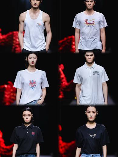 一是非遺技藝與現(xiàn)代設計交相輝映。本次時尚之夜以“時尚灣區(qū)•非遺新造”為主題,匯聚了粵港澳三地22個非遺服裝品牌。其中,利工民的展演作品尤為亮眼——品牌巧妙融合國家級非遺“粵繡(廣繡)”的細膩針法與區(qū)級非遺“利工民汗衫背心制作技藝”的經(jīng)典工藝,打造出系列“非遺潮T”。走秀環(huán)節(jié)中,模特身著的這些汗衫背心看似簡約,實則暗藏巧思:胸前精致的青銅紋樣與醒獅圖案,是廣繡技藝與百年汗衫工藝的完美對話;特別是“饕餮紋”的黑色背心,古老紋樣經(jīng)現(xiàn)代設計煥變?yōu)槌笨釄D騰,生動詮釋了傳統(tǒng)技藝在當代服飾中的創(chuàng)新表達。