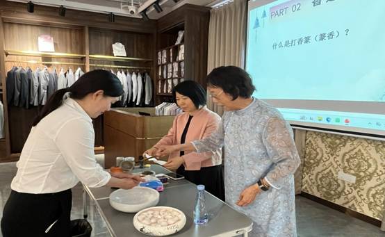 本次活動(dòng)特邀非遺企業(yè)廣州市老山香業(yè)貿(mào)易有限公司的莊老師和周老師進(jìn)行現(xiàn)場(chǎng)教學(xué)。老師們系統(tǒng)介紹了香道文化的歷史脈絡(luò)與精神內(nèi)涵,闡述了香道與“衣食住行”、中醫(yī)藥、美學(xué)文化及個(gè)人修養(yǎng)的密切聯(lián)系,并重點(diǎn)講解了宋代篆香的文化淵源與操作禮儀。