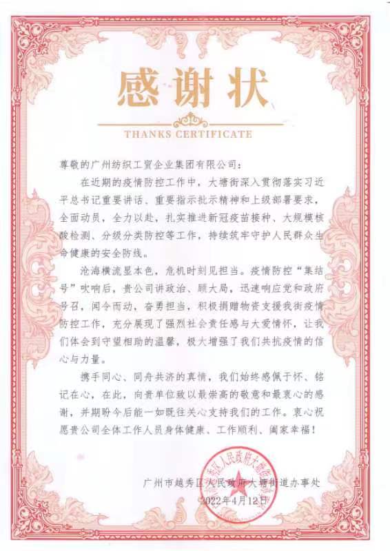 當(dāng)前,廣州疫情趨緊,4月12日,紡織公司黨委書(shū)記、董事長(zhǎng)簡(jiǎn)瑋儀,黨委副書(shū)記、紀(jì)委書(shū)記、工會(huì)主席丘海瀾親自帶隊(duì),把1500盒利工民毛巾送到了越秀區(qū)大塘街道。