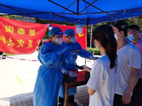 張湘軍夫婦在景泰街大金鐘社區(qū)核酸檢測(cè)現(xiàn)場(chǎng)工作