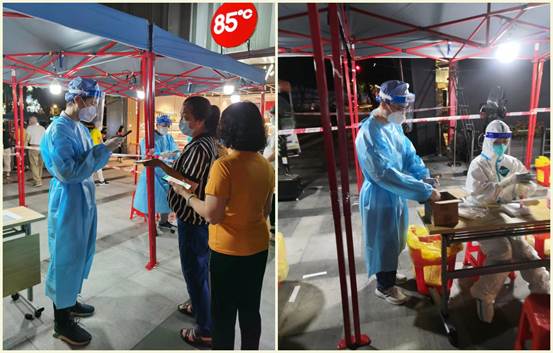 由于陳炯龍、陳英東兩位此前都有過負(fù)責(zé)核酸檢測(cè)掃碼工作的經(jīng)驗(yàn),在志愿服務(wù)崗前培訓(xùn)會(huì)議上,他們主動(dòng)提出要承接這項(xiàng)亟需專注力和耐心的工作。陳炯龍為老人家仔細(xì)核對(duì)姓名、身份證號(hào),耐心解釋工作流程,獲得老人一致好評(píng)。當(dāng)醫(yī)護(hù)組上缺少志愿者時(shí),陳英東又化身為核酸檢測(cè)樣管“護(hù)送人”,認(rèn)真核對(duì)核酸樣管數(shù)量及檢測(cè)人數(shù),及時(shí)準(zhǔn)確地報(bào)送給醫(yī)護(hù)組……他們像陀螺一樣從晚上8點(diǎn)開始連軸轉(zhuǎn)忙碌到半夜12點(diǎn)多才結(jié)束任務(wù)回家。